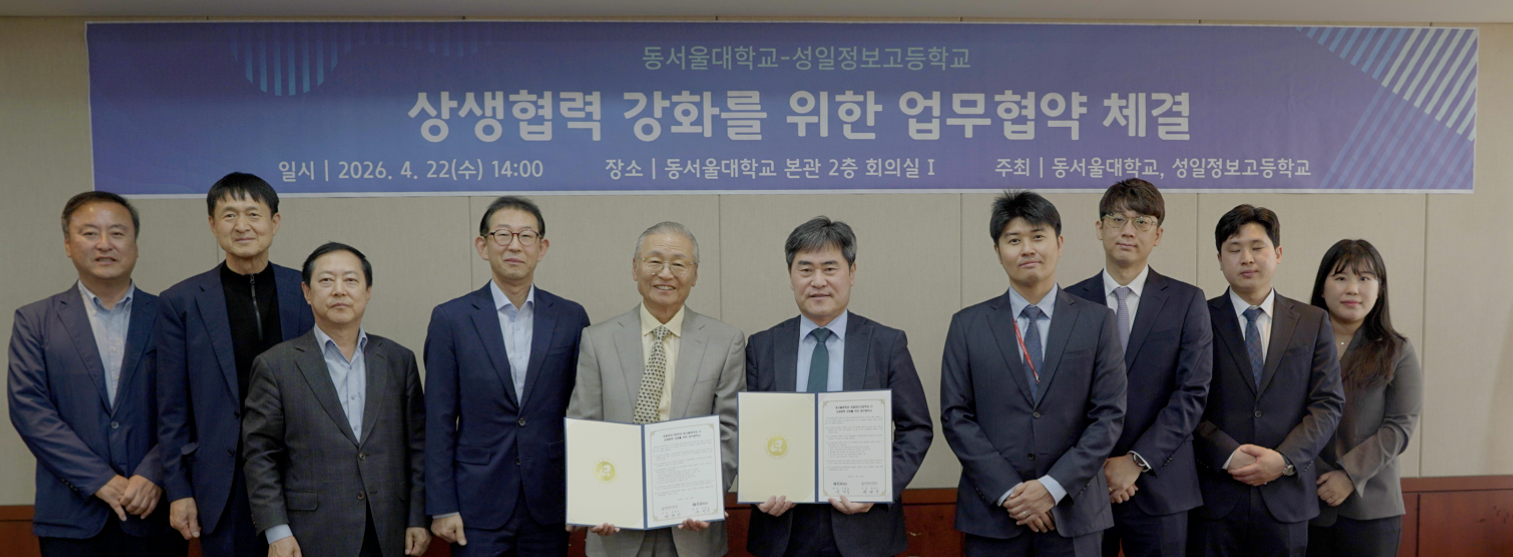 교내뉴스 동서울대학교-성일정보고등학교, '라이브커머스·뷰티' 미래 인재 양성을 위한 상생협력 강화 업무협약(MOU) 체결 동서울대학교(총장 유광섭)와 성일정보고등학교(교장 변영진)는 2026년 4월 22일(수) 오후 2시, 동서울대학교 본관 회의실에서 상생협력 강화 업무협약(MOU)을 체결했다고 밝혔다.  이번 협약을 통해 최근 급성장하고 있는 라이브커머스 및 뷰티 산업 분야를 중심으로, 미래 산업을 이끌어갈 실무형 전문인재 양성를 양성하고 긴밀한 교육 협력 체계를 구축하기 위해 마련됐다. 양 기관은 △라이브커머스 및 뷰티 관련 학과 교육과정 공유 및 컨설팅, △학과 간 협업을 통한 다양한 인적 네트워크 시스템 구축, △동일계열 진학 및 취업 관련 상호작용 및 정보공유, △인적·물적 기반 공유를 통한 교육활동 지원 등에 협력하기로 뜻을 모았다. 협약식에는 동서울대학교 총장과 입학홍보처장, 고교홍보지원관 등 대학 관계자를 비롯해 성일정보고등학교 교장, 취업전략부장, 교육과정부장, 마케팅과 교사 및 뷰티과 교사가 참석해 미래지향적인 직업 교육 발전 방향에 대해 심도 있는 논의를 나눴다. 특히 성일정보고등학교는 유통 산업의 새로운 핵심으로 떠오른 라이브커머스 분야 인재를 조기에 육성하고자 학과 개편을 준비중이며, 이를 위해 동서울대학교의 우수한 실습 인프라와 심화된 실무 교육과정을 벤치마킹 모델로 삼았다. 이에 따라 동서울대학교는 신설 학과가 성공적으로 안착할 수 있도록 운영 전반에 대한 맞춤형 전문가 컨설팅을 제공하기로 뜻을 모았다. 동서울대학교 관계자는 "성일정보고의 학과가 성공적으로 자리매김하고 우수한 성과를 낼 수 있도록 대학 차원의 인적·물적 지원을 아끼지 않을 것"이라며, "앞으로도 지역 고등학교와의 유기적인 연계와 소통을 통해 산업 현장이 즉시 필요로 하는 실무 전문 인재를 양성하는 데 앞장서겠다"고 밝혔다. 2026.04.24