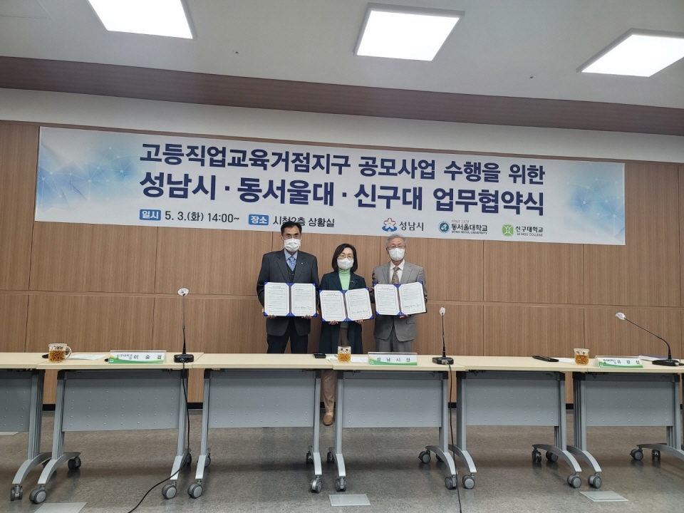 동서울대학교는 지난 3일 성남시, 신구대학교와 함께 고등직업교육거점지구 공모사업을 추진하기위해 업무협약을 체결했다.