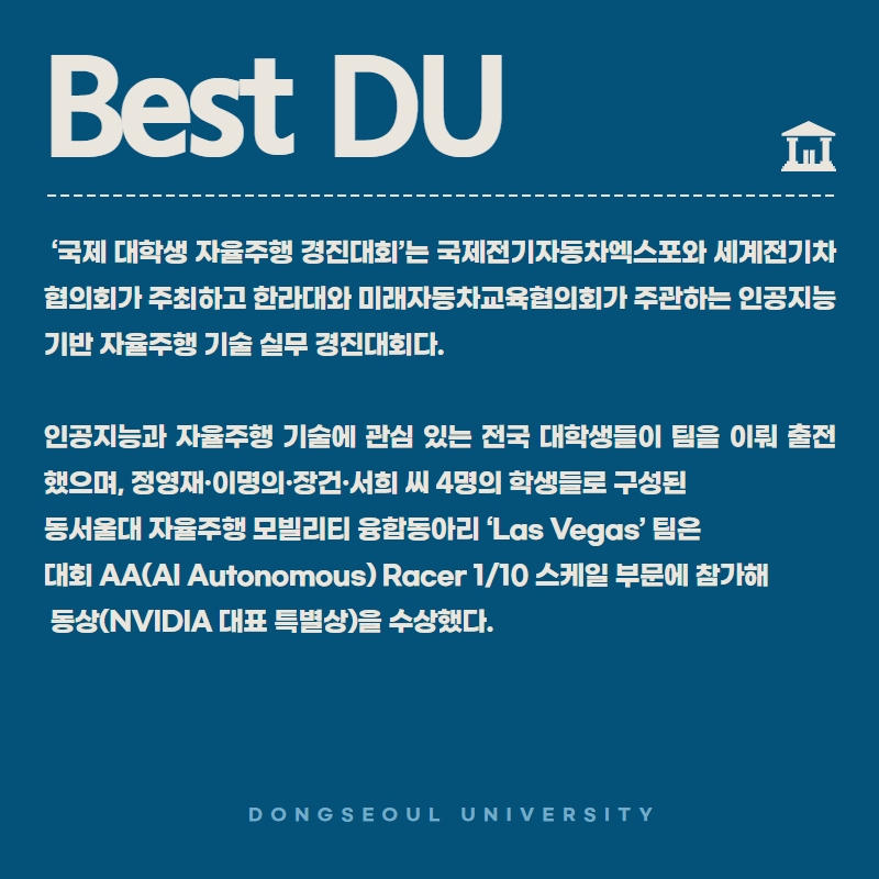 정영재·이명의·장건·서희 씨 4명의 학생들로 구성된 동서울대 자율주행 모빌리티 융합동아리 ‘Las Vegas’ 팀은 대회 AA(AI Autonomous) Racer 1/10 스케일 부문에 참가해 동상(NVIDIA 대표 특별상)을 수상했다.