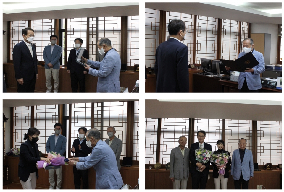 2022년 8월 29일(월) 오전 10시 우리대학 이사장실에서 정년퇴직 교원에 대한 공로패 수여식이 거행되었습니다. 정년퇴직 교원은 컴퓨터정보보안과 권창영 교수, 아동보육과 손순복 교수 이상 2명으로 재직기간 동안의 공적을 기리고자 공로패와 포상이 수여되었습니다. 이사장님께서는 우리대학 각 분야에서 질 높은 교육을 위해 헌신적인 노력을 해온 이들에게 그간의 노고에 대한 감사의 마음을 전하셨습니다.