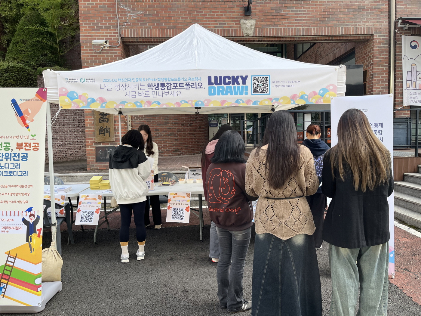 교내뉴스 2025학년도 DU 핵심인재 인증제 및 학생통합포트폴리오(i-Pride) 홍보행사 개최 동서울대학교(총장 유광섭) 교육혁신지원센터는 지난 10월 23일 학산도서관 앞 광장에서 2025학년도 「DU 핵심인재 인증제 및 학생통합포트폴리오(i-Pride)」홍보 행사를 개최했다.   이번 행사는 재학생들이 DU 핵심인재 인증제와 학생통합포트폴리오(i-Pride) 시스템에 대한 관심과 인지도를 높여, 대학생활 중 스스로 핵심역량을 함양하고 미래 사회가 요구하는 인재로 성장하도록 독려하는 것을 목적으로 추진되었다.   특히 올해 행사는 인지도 조사 참여자를 대상으로 경품추첨 이벤트를 새롭게 도입하여 학생들의 적극적인 참여를 이끌었다. 현장에서는 QR코드를 활용해 간편한 방식의 인지도 조사가 진행되었으며, 참여자가 직접 추첨을 통해 소정의 상품을 받을 수 있는 방식으로 운영되어 큰 호응을 얻었다.   이날 행사에서는 대학일자리센터의 취업(Cheer up)트럭과 창업교육센터의 창업아이템 판매 플리마켓 행사도 함께 진행되어, 재학생들이 진로와 창업 관련 정보를 얻는 동시에 핵심역량과 연계된 다양한 체험의 기회를 가질 수 있는 시너지 효과를 창출할 수 있었다.   교육혁신지원센터는 올해 대학의 핵심역량 및 핵심인재인증제 제도를 소개하는 책자를 새로 발간하여 학과와 행사 현장에서 함께 배포했다. 이를 통해 학생들이 제도 전반을 쉽게 이해할 수 있도록 지원했으며 학년도 말에 진행될 DU 핵심인재 인증제 시상식과 연계하여 학생들이 다양한 교과 및 비교과 프로그램 참여를 통해 자신의 역량을 지속적으로 성장시킬 수 있도록 안내할 계획이다.   교육혁신 지원센터는 앞으로도 학생들이 대학생활 전반에서 6대 핵심역량(바른인성, 자기계발, 창의·융합, 실무전문성, 사회적 공감, 헌신적 실천)을 고루 갖춘 핵심인재로 성장할 수 있도록 다양한 프로그램을 운영하며 지속적인 교육혁신을 추진해 나갈 방침이다. 2025.11.04